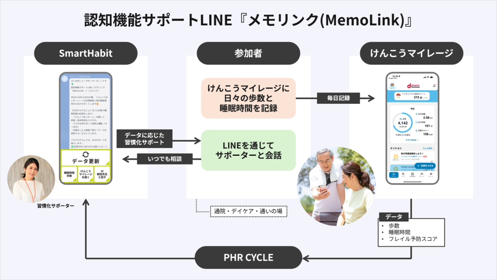 本事業における提案内容及び審査の結果に基づき、習慣化プラットフォーム「Smart Habit」を開発・運営するサービス事業者のWizWeとPHR事業者のNTTドコモビジネスのマッチングが成立し、高齢者の認知機能の維持と健康的な生活習慣づくりをサポートするサービスの実証として、認知機能サポートLINE『メモリンク(MemoLink)』(以下 本実証) を開始いたします。
